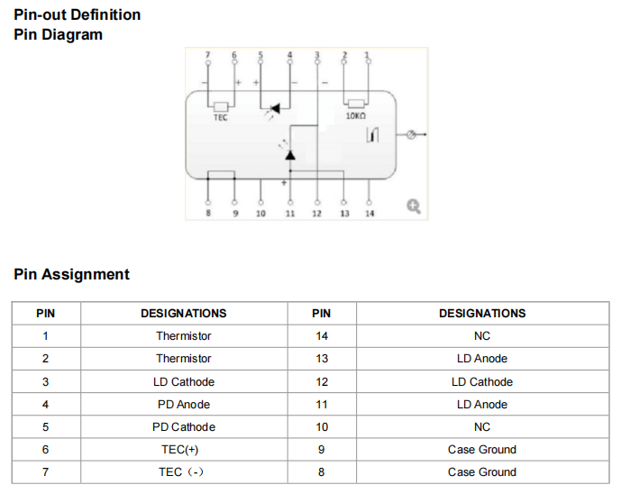TLT-DFB-1310-10-SM 激光模塊采用平面結(jié)構(gòu),芯片安裝在載板上。高功率芯片封裝在無環(huán)氧樹脂、無助焊劑的 14 引腳蝶形封裝中,并配備熱敏電阻、熱電制冷器和監(jiān)測(cè)二極管。